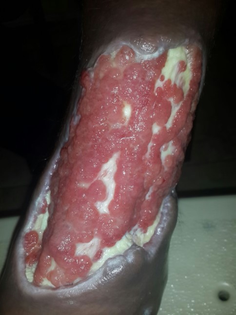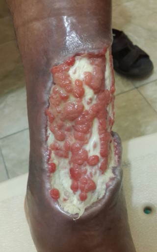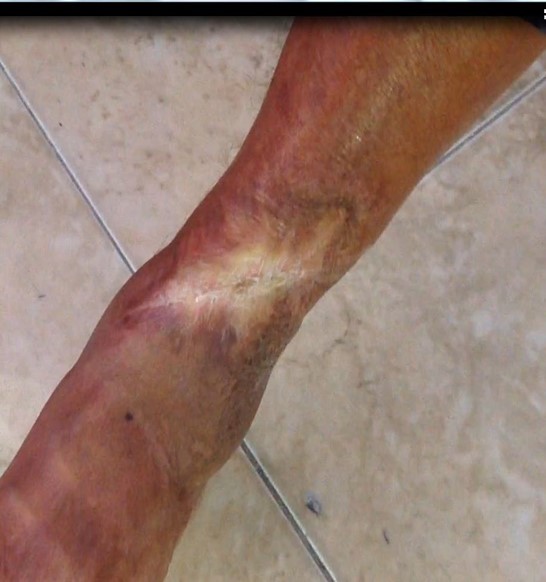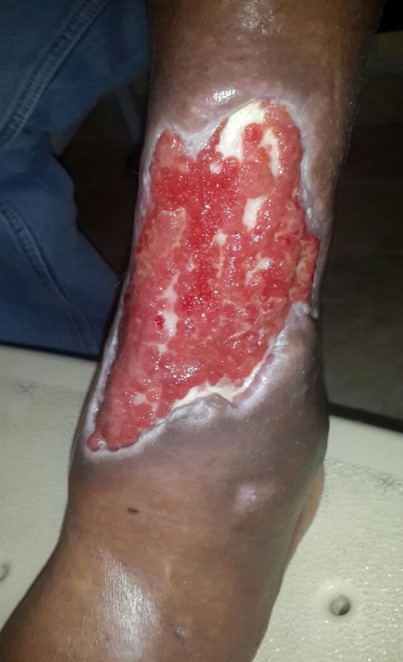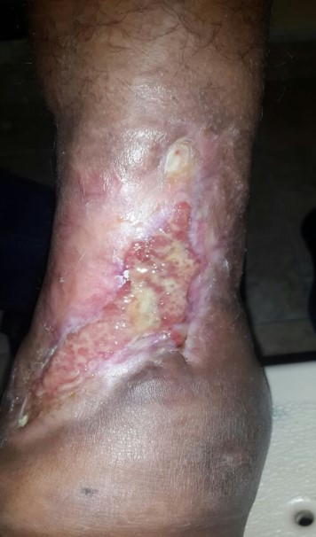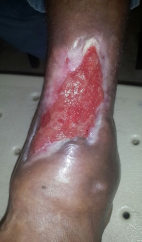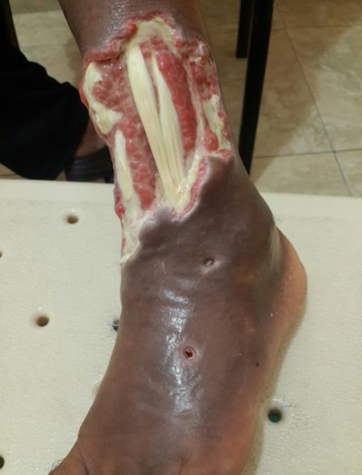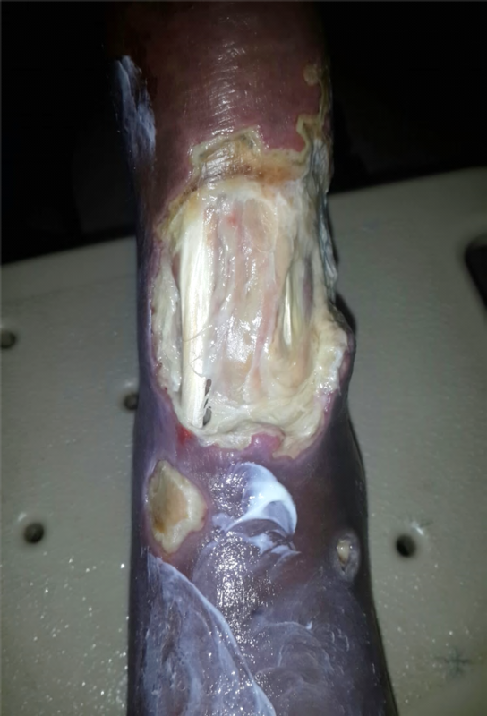 Para empezar, clínicamente se aprecian dos heridas anulares en la cara anterior y circundante al maleolo interno de pie izquierdo, con áreas extensas de necrosis y signos francos de infección.